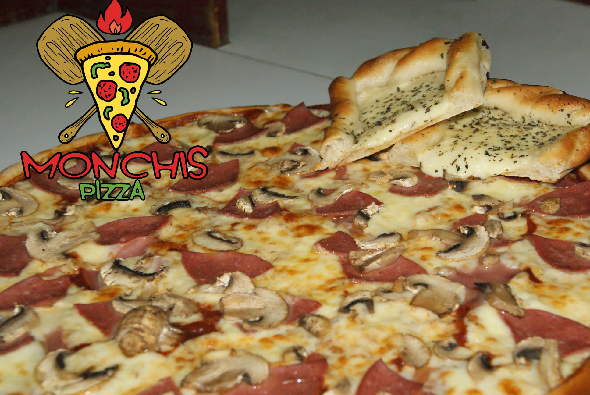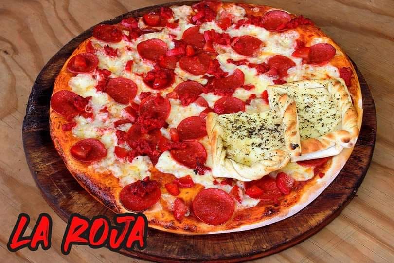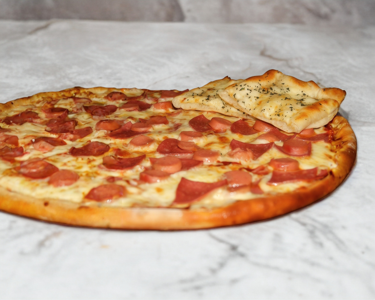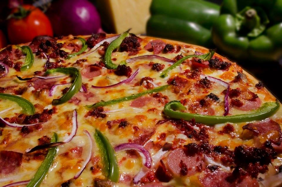 Queso, jamón, salami, chorizo, salchicha de pavo, champiñones, cebolla y pimiento verde.
