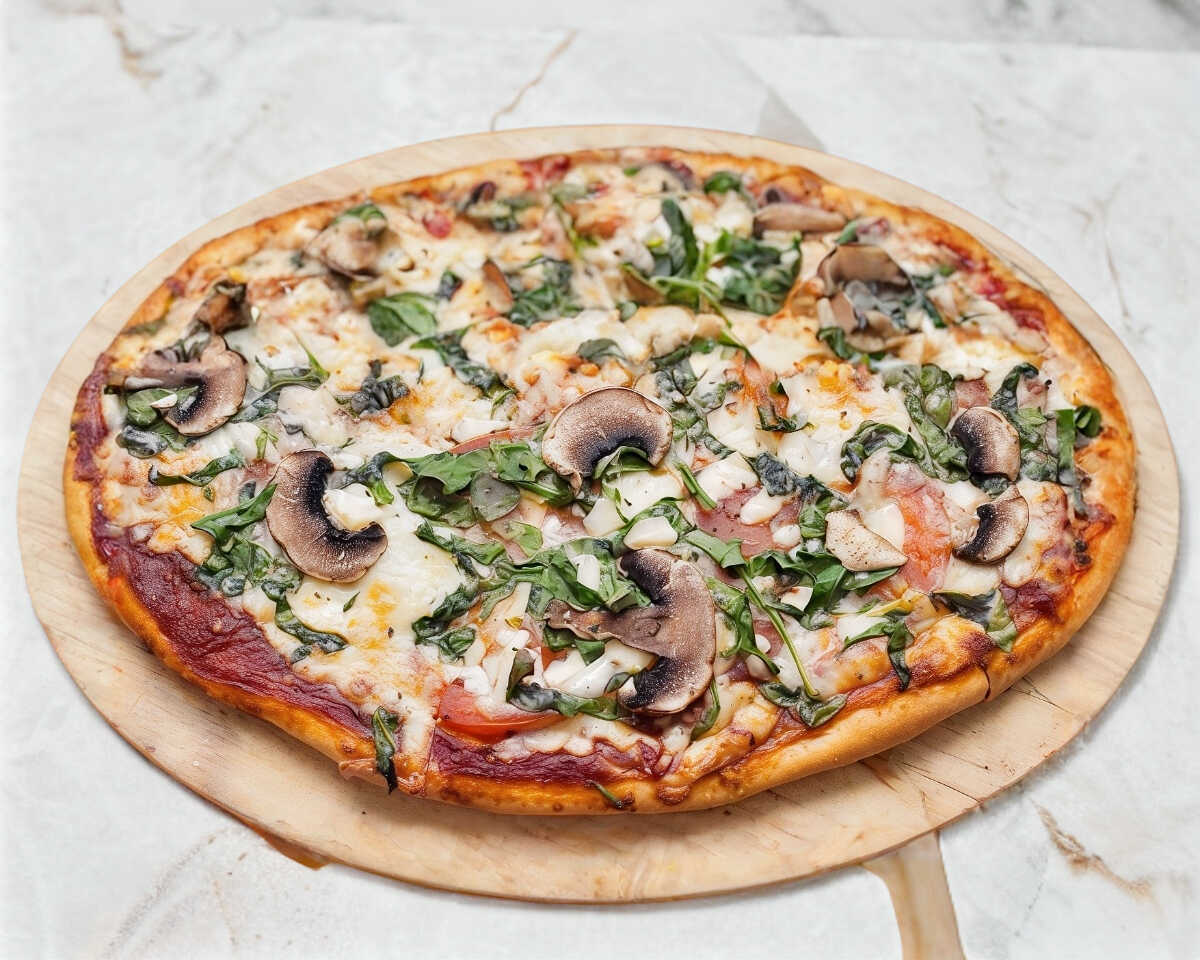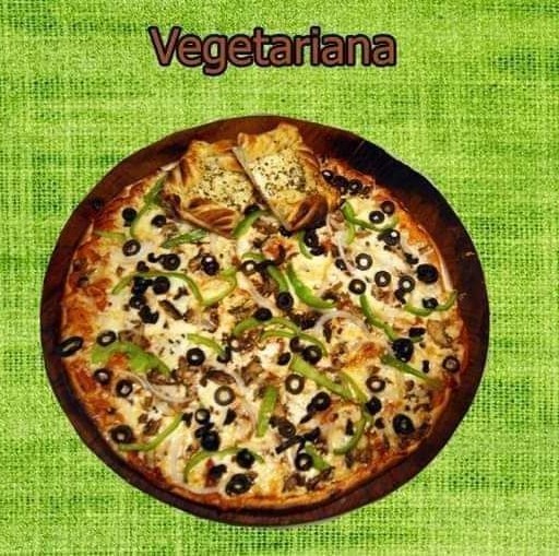 Queso, champiñones, cebolla, pimiento verde, aceitunas negras.
