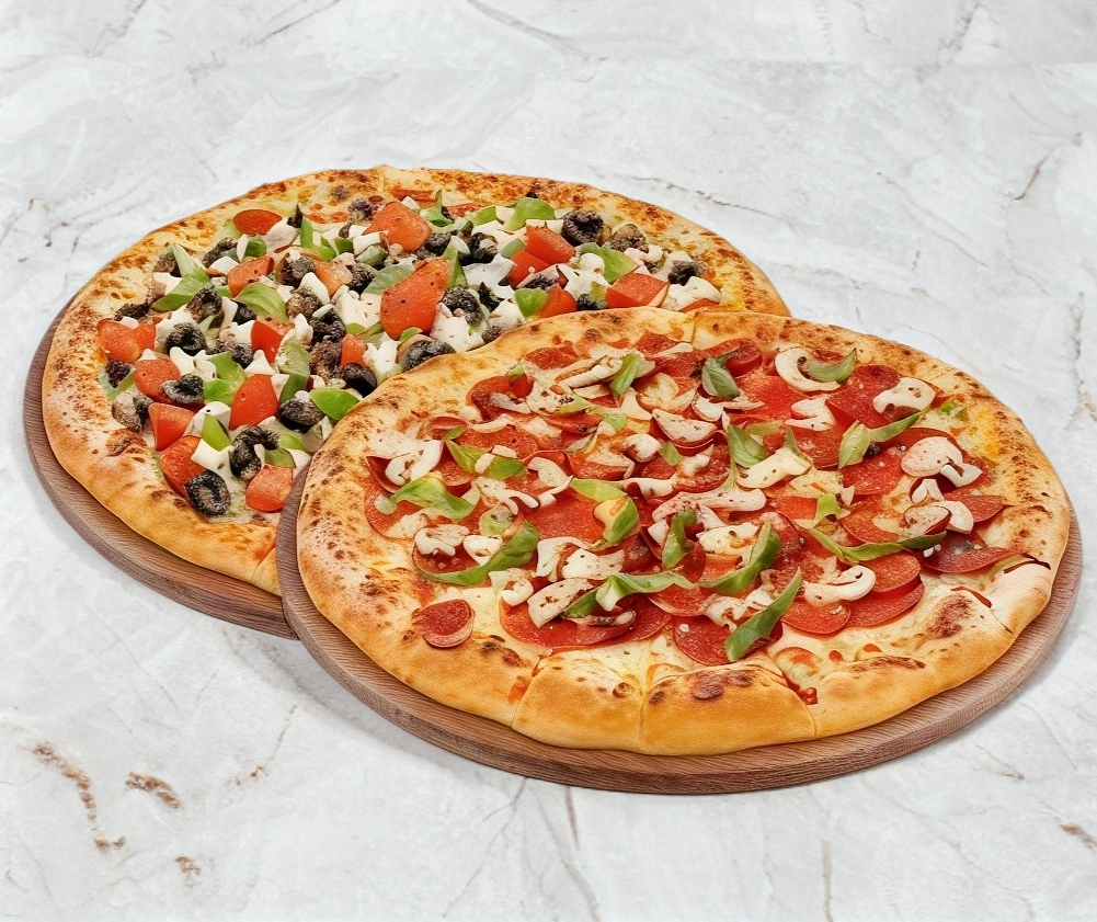 2 Pizzas grandes, 2 ingredientes a elegir, más 1 orden de pan con ajo y queso.