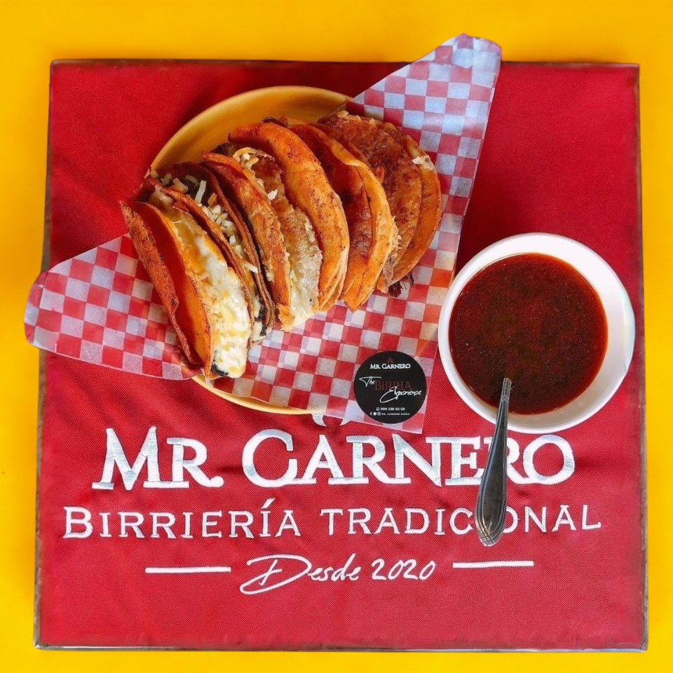 6 piezas de tortilla doble con carne de birria y queso marmoleado, fritas y bañadas en nuestro mole especial Mr. Carnero, acompañadas de nuestras salsas Mr. Carnero acompañadas de 2 consomés individuales de 150 ml