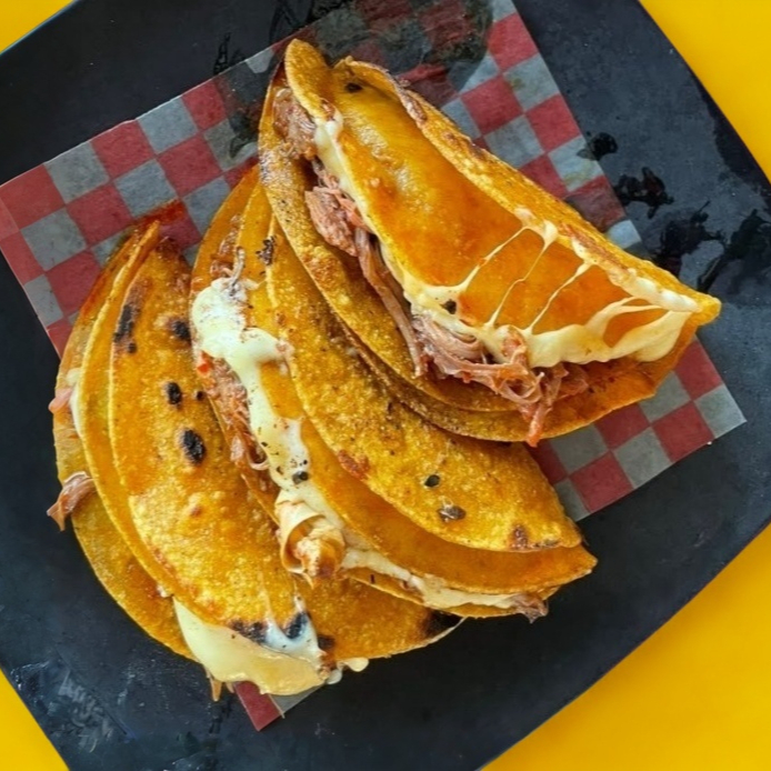 Tortilla doble de maíz con carne de birria y queso marmoleado, fritas y bañadas en nuestro mole especial Mr. Carnero.