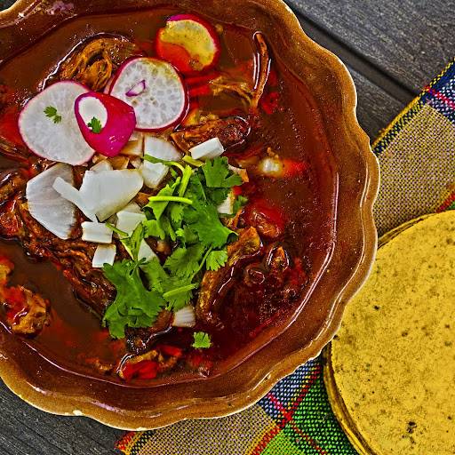 Totopos home-made bañados con consomé y salsa roja creación de la casa con nuestra carne de birria suavecita y jugosa.