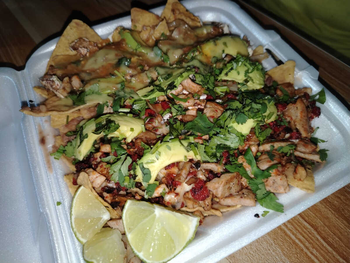 Crujientes nachos cubiertos con carne asada con chorizo y cebolla asada, queso y aderezos.