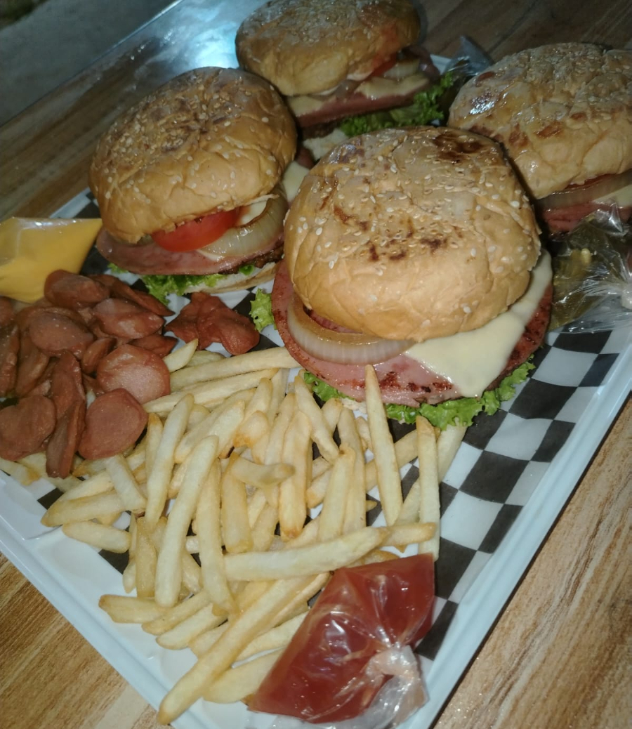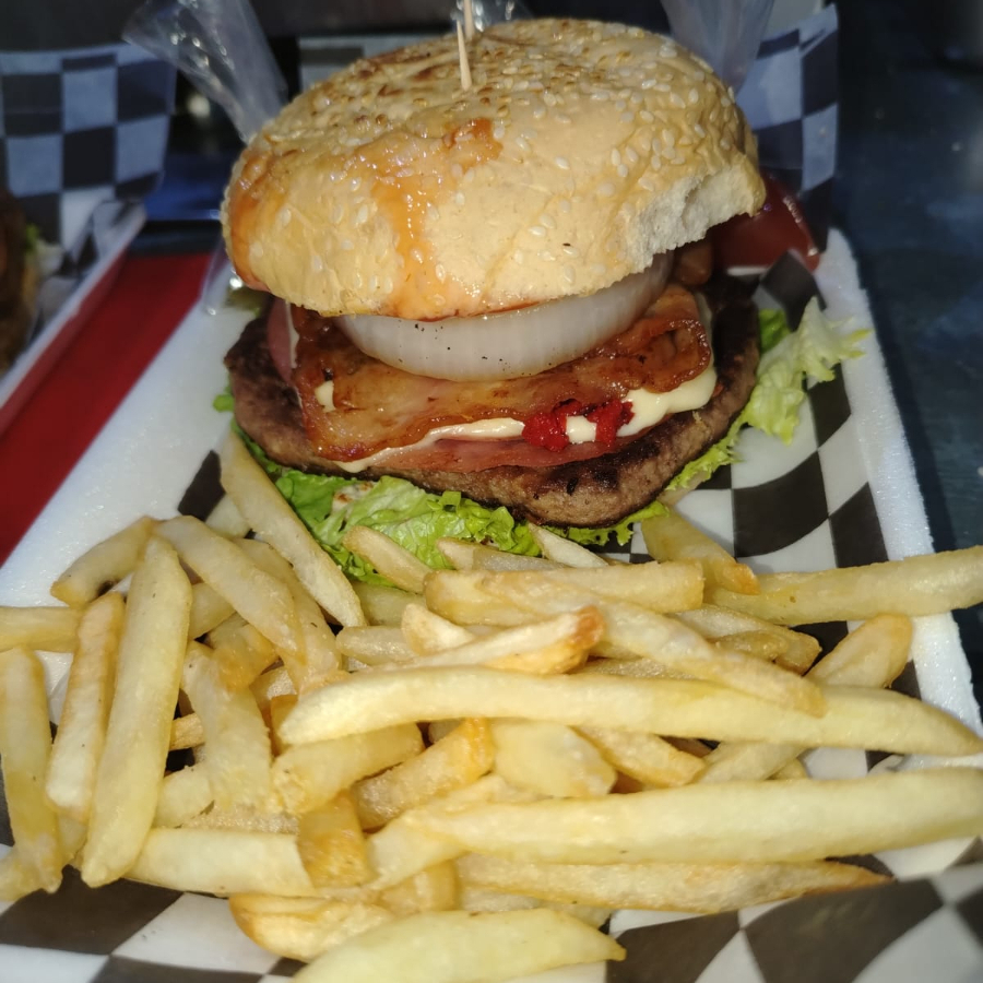 1 Tranca original y 1 hamburguesa sencilla, acompañada de papas fritas.