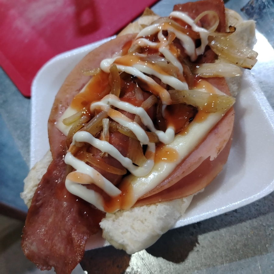 Salchicha de hot-dog en pan con tocino, jamón y queso.