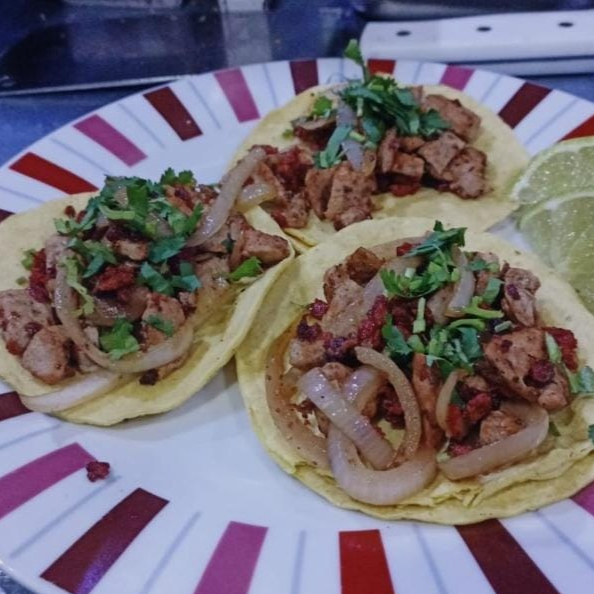 Orden de tacos(3) carne asada con chorizo, cebolla asada y cilantro sobre doble tortilla
