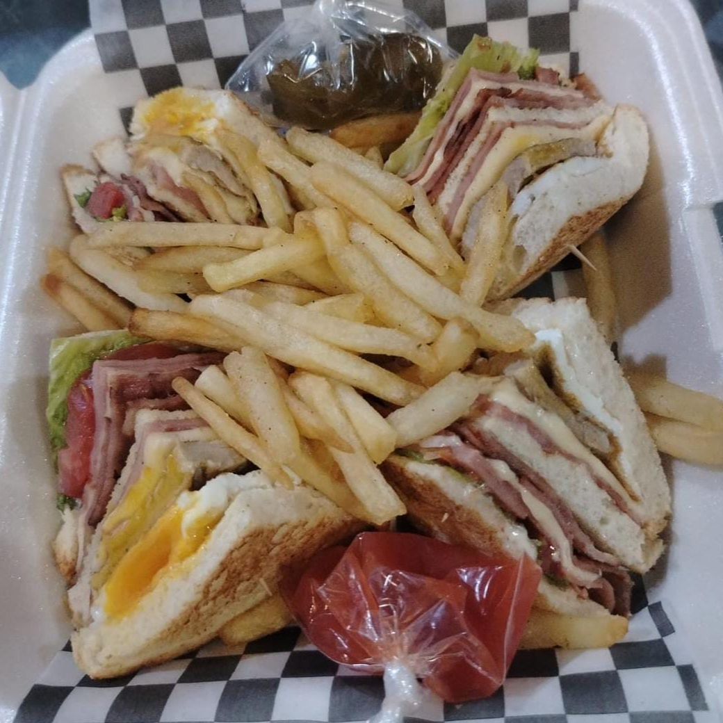 Sándwich de triple piso con pollo a la plancha, huevo estrellado, jamón, queso, tocineta, vegetales y papas fritas.