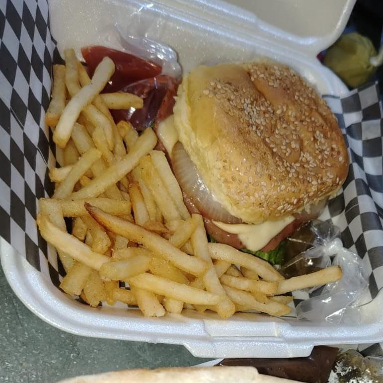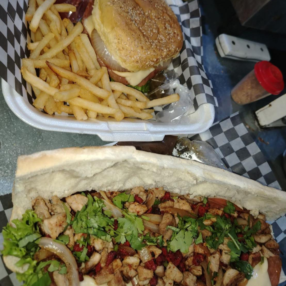 Carne a la plancha en pan de hamburguesa con ingredientes básicos como lechuga, tomate y aderezos, acompañada de una porción de papas fritas.