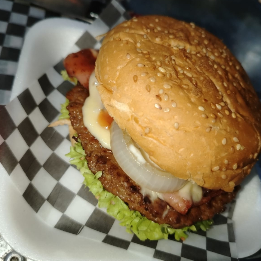 Carne a la plancha en pan de hamburguesa con ingredientes básicos como lechuga, tomate y aderezos.