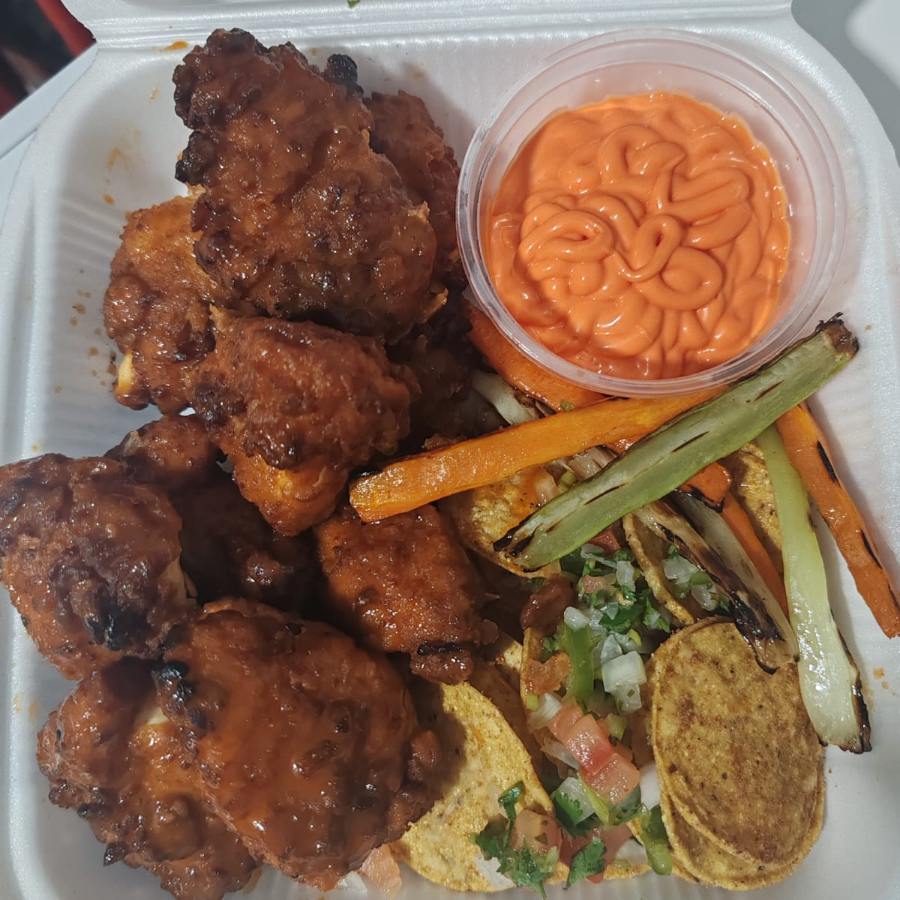 Deliciosos boneless de pollo bañados en el aderezo de su preferencia, acompañados con totopos, pico de gallo y verduras.