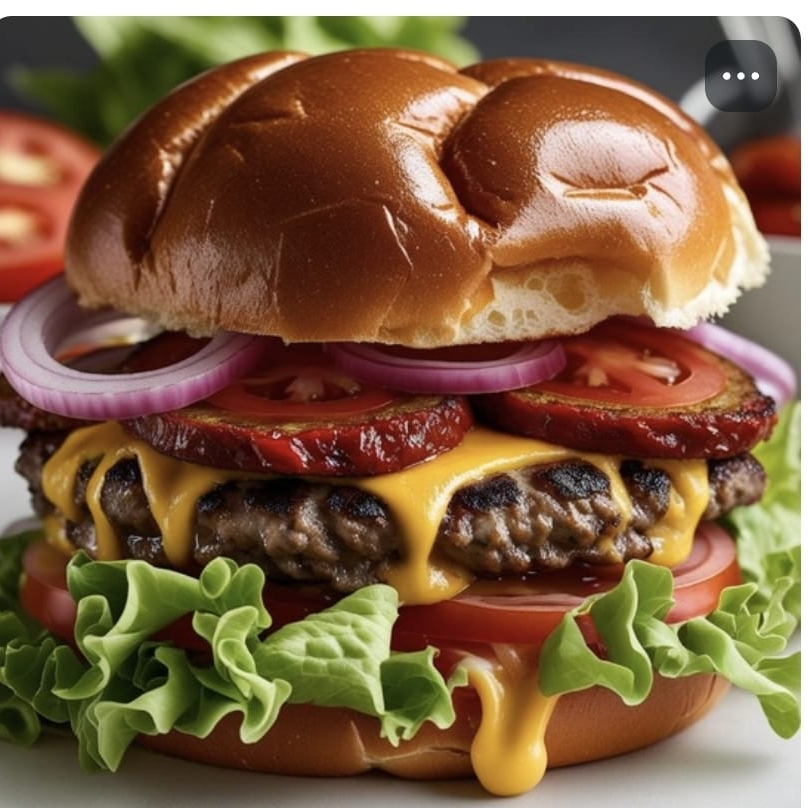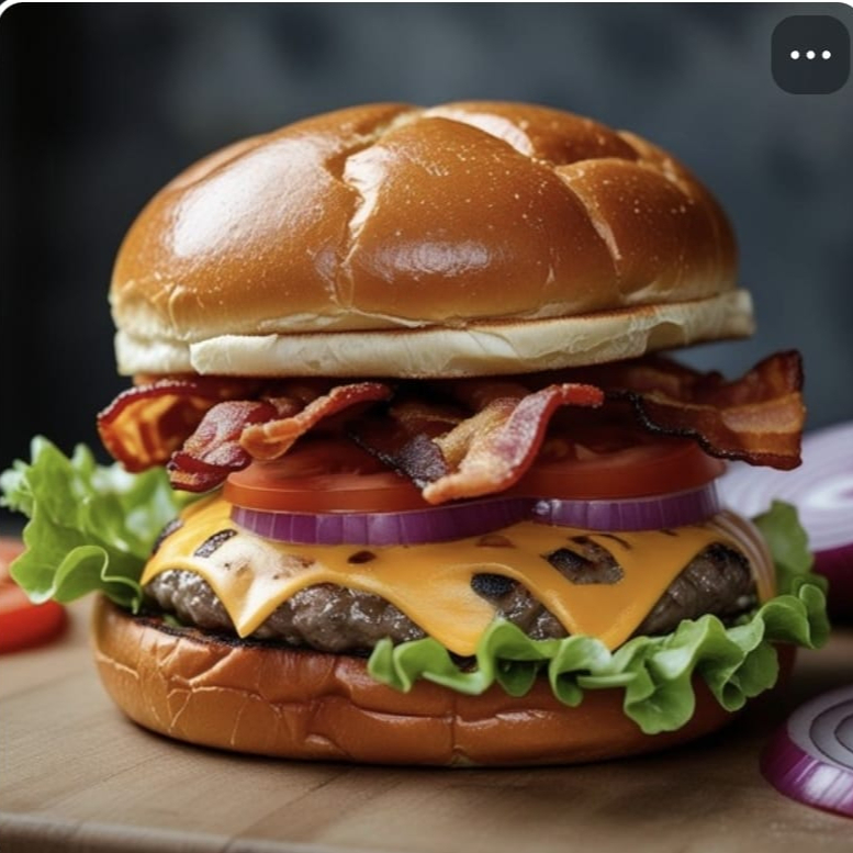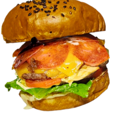 Hamburguesa super deliciosa carne sirloin (120g), queso derretido, jamón que se asoma con flow, vegetales y cebolla caramelizada.