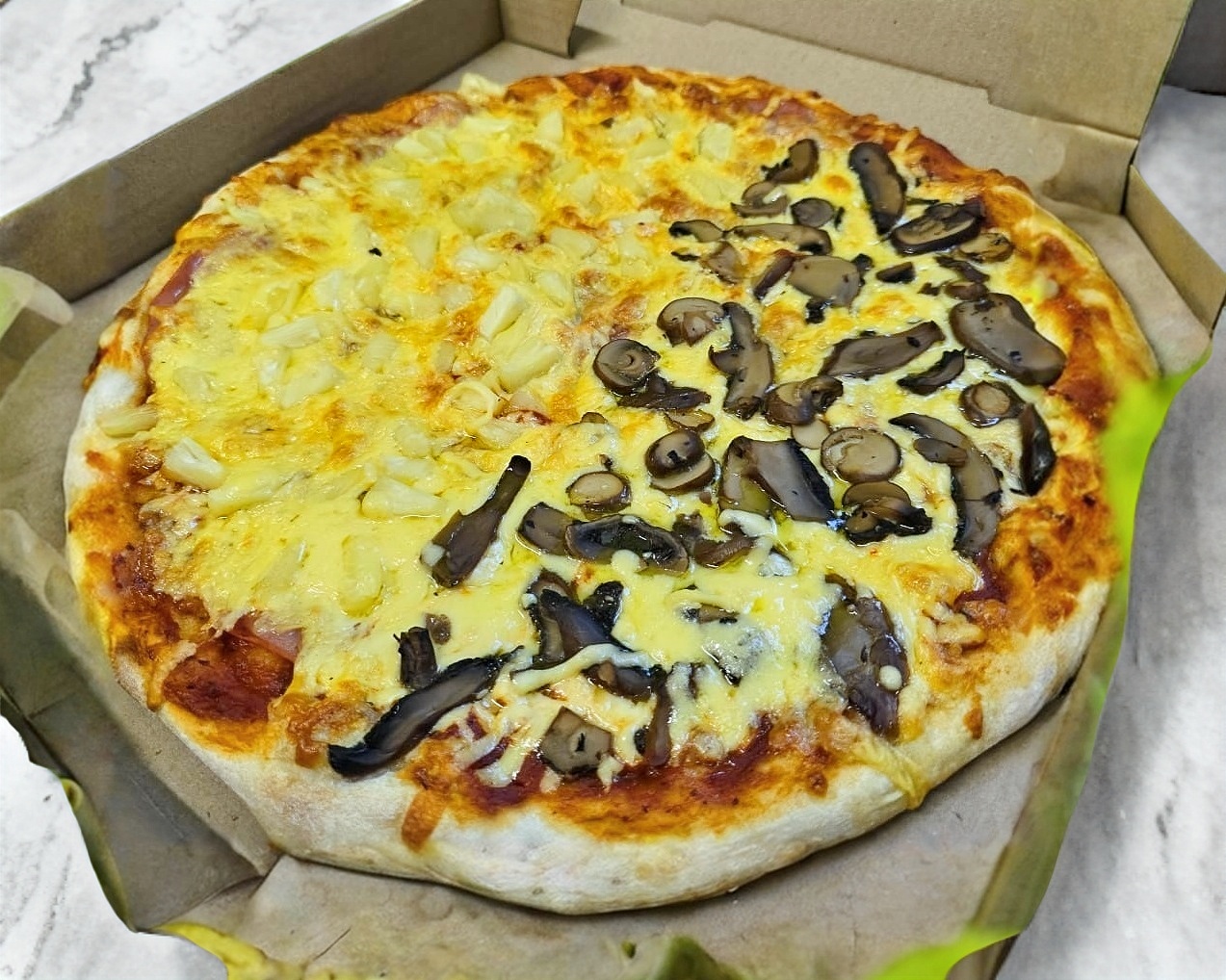 Pizza mitad HAWAIANA y mitad champiñon