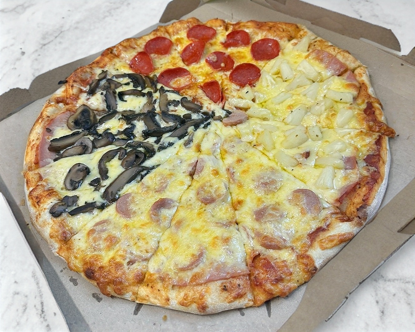 Pizza grande de 12 rebanas mitad jamon y piña y mitad jamon y champiñon