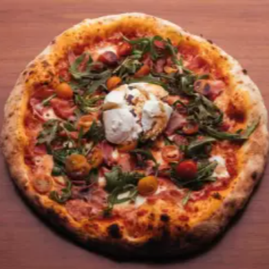 Queso mozzarella, jamón serrano, tomate cherry, arúgula, burrata y vinagre balsámico.