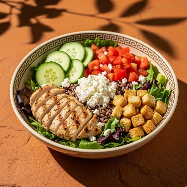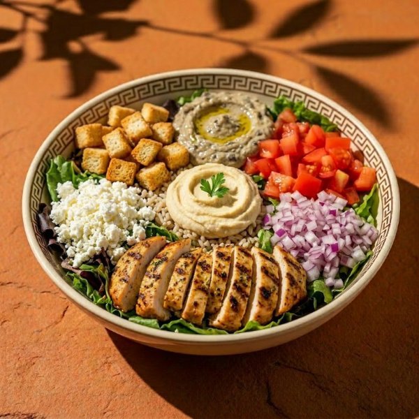 Bowl con base de arroz integral, mezcla de lechugas, pollo,dip de berenjena, hummus de garbanzo, jitomate, crutones y queso de cabra. Vinagreta: Libanesa.