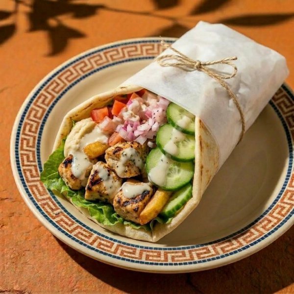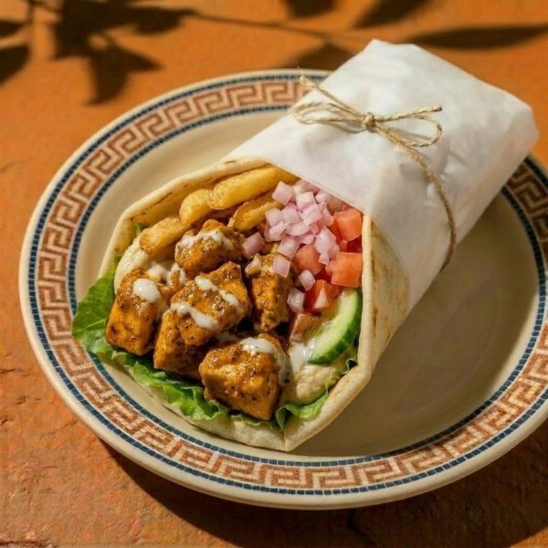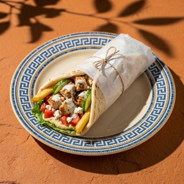 Pan pita,lechuga, pollo, hummus de garbanzo, papas fritas, jitomate, pepino, cebolla morada y vinagreta libanesa. Incluye Salsa Peri Peri por separado.