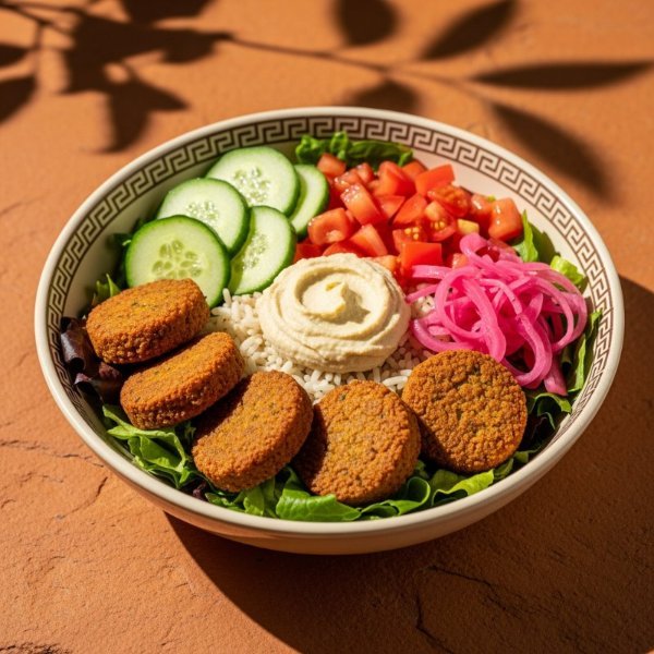 Bowl con base de arroz integral, mezcla de lechugas, Falafel (5), hummus de garbanzo, jitomate, pepino,y cebolla encurtida Vinagreta: Libanesa.