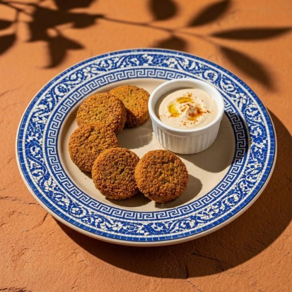 Mini bowl con porción de falafel crujiente (5 unidades) y suave hummus de garbanzo (100 g), una combinación deliciosa y saludable