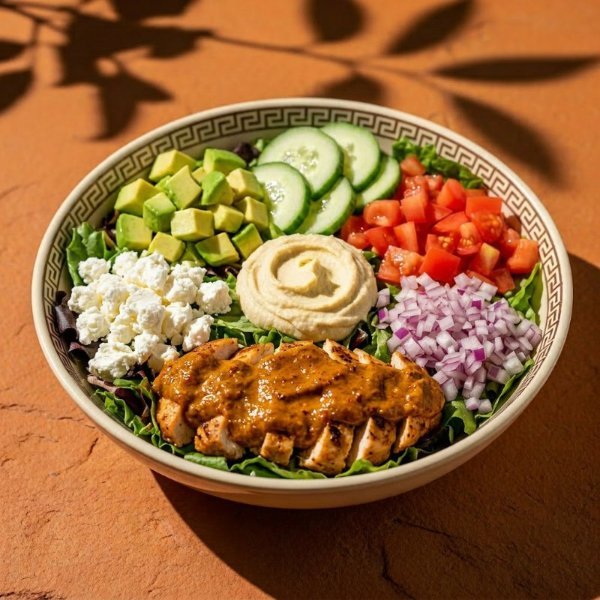 Bowl con base de arroz integral, mezcla de lechugas, pollo con salsa periperi, hummus de garbanzo, jitomate, pepino,cebolla morada, brocoli aguacate y queso de cabra. Vinagreta: Libanesa.