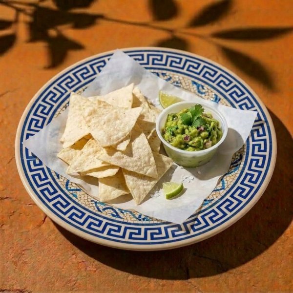Disfruta una porción de totopos de maíz con guacamole hecho con aguacate, pico de gallo, sal, limón y pimienta (280 gr).