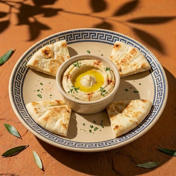 Pan pita, acompañada de hummus de garbanzo.