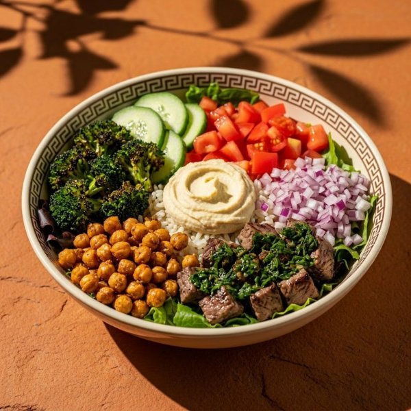 Bowl con base de arroz integral, mezcla de lechugas, arrachera con chimichurri, hummus de garbanzo, jitomate, pepino,cebolla morada, brocoli rostizado y garbanzos crujientes. Vinagreta: Libanesa.