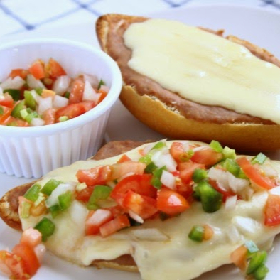 Pan al horno bañados de una cama de frijol, gratinados con queso manchego acompañados de picó de gallo.