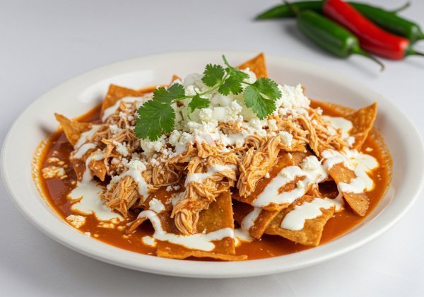 Chilaquiles con salsa roja, pollo deshebrado, queso, crema, cebolla y cilantro. *Salsa aparte para que decidas si los quieres suaves o crocantes.