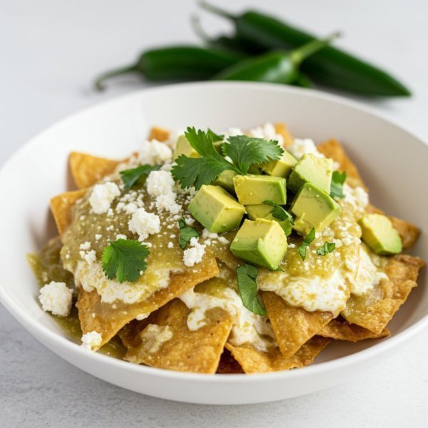 Chilaquiles con salsa verde, pollo deshebrado, queso, crema, cebolla y cilantro. *Salsa aparte para que decidas si los quieres suaves o crocantes.