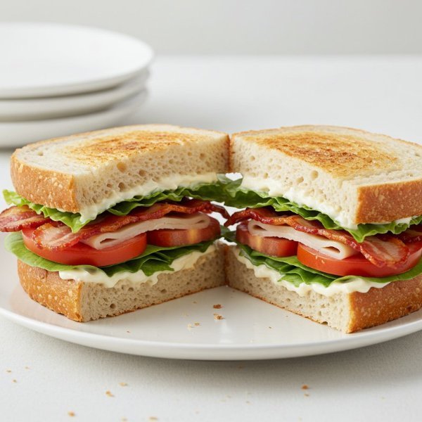 Sándwich de pan toscano con mayonesa crujiente tocino jitomate fresco y lechuga creando una combinación clásica y deliciosa.