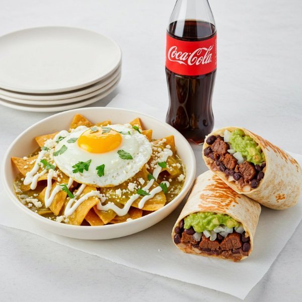 Combo que incluye una orden de chilaquiles verdes con huevo, un burrito de arrachera y bebida a elección.