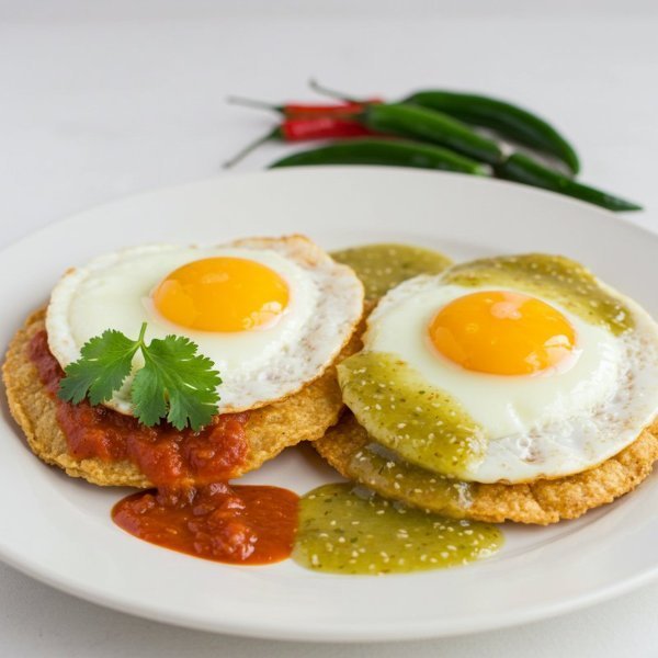 Huevos estrellados con su yema, cubiertos de salsa roja y verde, montados sobre tortillas fritas doradas.