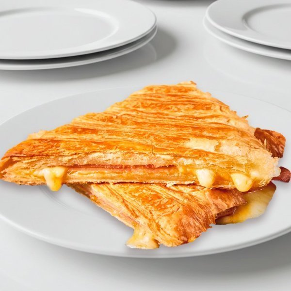 Delicioso croissant de mantequilla doblado, relleno con jamón de cerdo, queso doble crema y queso cheddar derretido.
