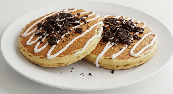 Esponjosos pancakes con trocitos de galleta Oreo triturada cubiertos con frosting de queso crema y yogur.