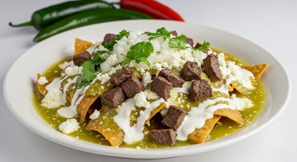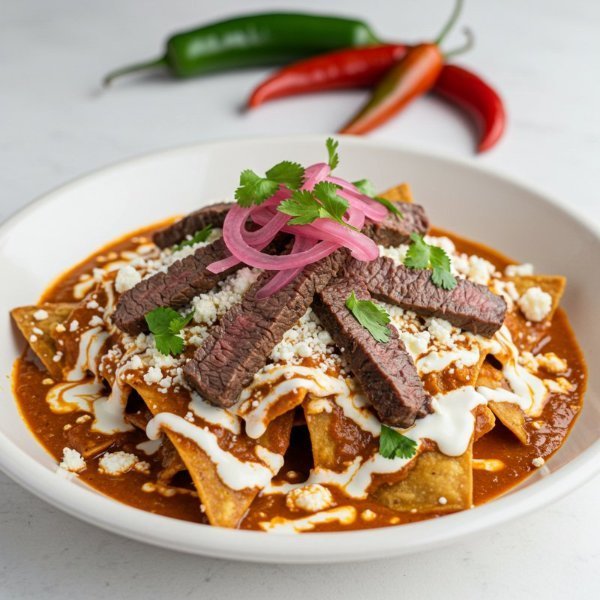 Chilaquiles con salsa tatemada, arrachera, queso, crema, cebolla encurtida y cilantro. *Salsa aparte para que decidas si los quieres suaves o crocantes."