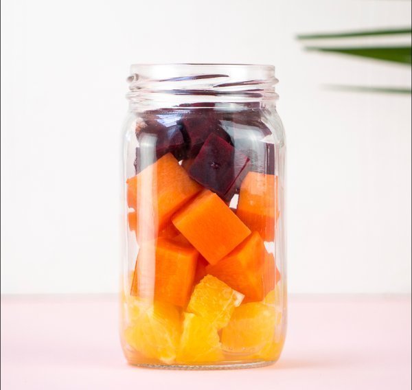 Jugo fresco de betabel, naranja y zanahoria, una mezcla nutritiva y llena de sabor, perfecta para un impulso de energía natural (250 ml.)