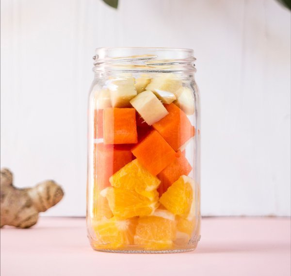 Jugo fresco de naranja, zanahoria y jengibre, una combinación revitalizante y llena de vitaminas, perfecta para energizar tu día. (250 ml).