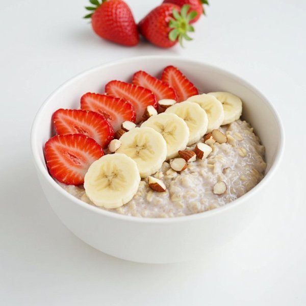Bowl de avena preparada (canela, miel, chia,yogur) acompañado de fresas, rodajas de plátano y crujientes almendras. (180 gr.)