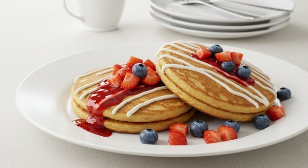 Pancakes recién hechos acompañados con nuestra mezcla de cheesecake, salsa de frutos rojos, fresa y blueberries.