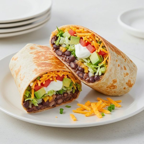 Burrito en tortilla de harina relleno de frijoles negros, queso cheddar derretido, lechuga fresca, jitomate jugoso, aguacate en cubos y crema.