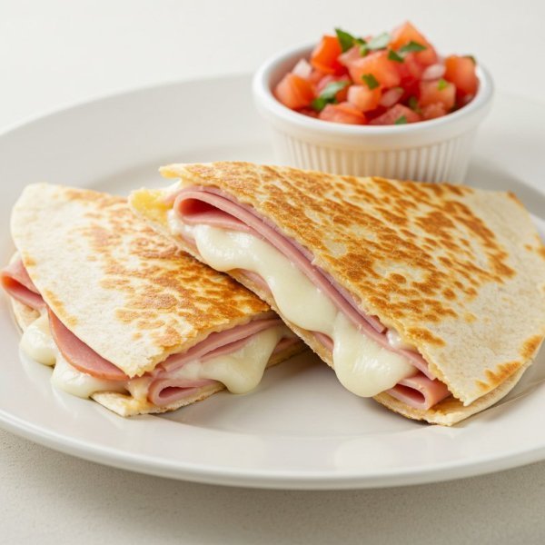 Orden de deliciosas sincronizadas rellenas de jamón de pavo y queso derretido, acompañadas de pico de gallo.
