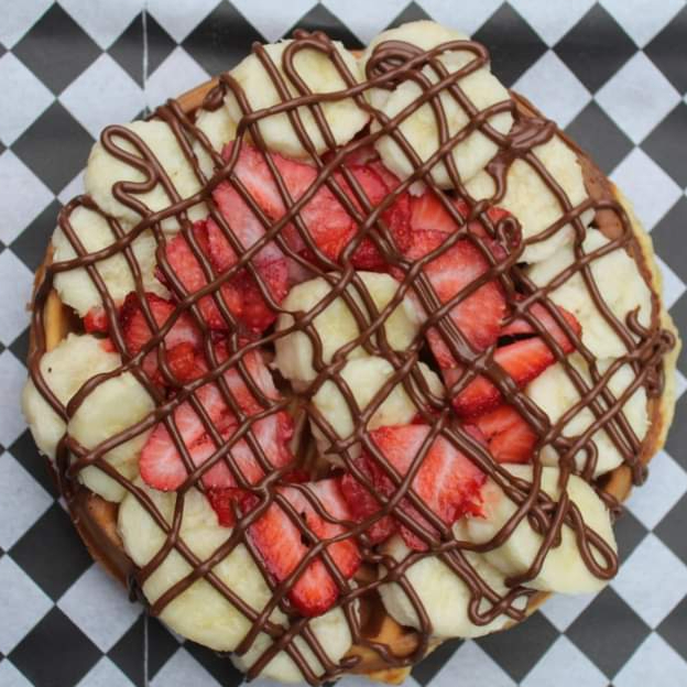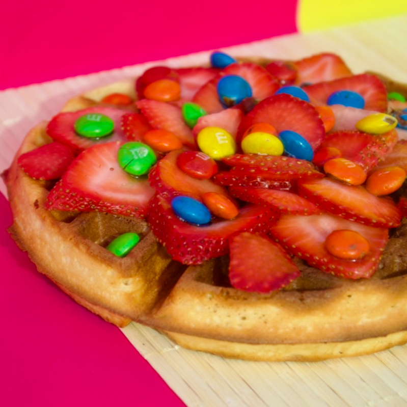 WAFFLE CON REBANADAS DE FRESA Y DULCES DE CHOCOLATE M&M'S, ACOMPAÑADO DE JARABE DE CHOCOLATE