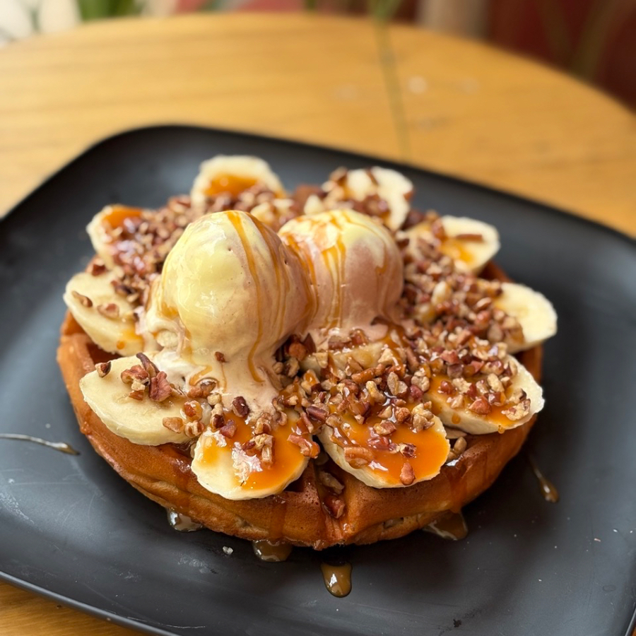 WAFFLE CRUJIENTE, CON BASE DE REBANADAS DE PLATANO, TROZOS DE NUEZ, CAJETA, Y HELADO DE VAINILLA ARRIBA