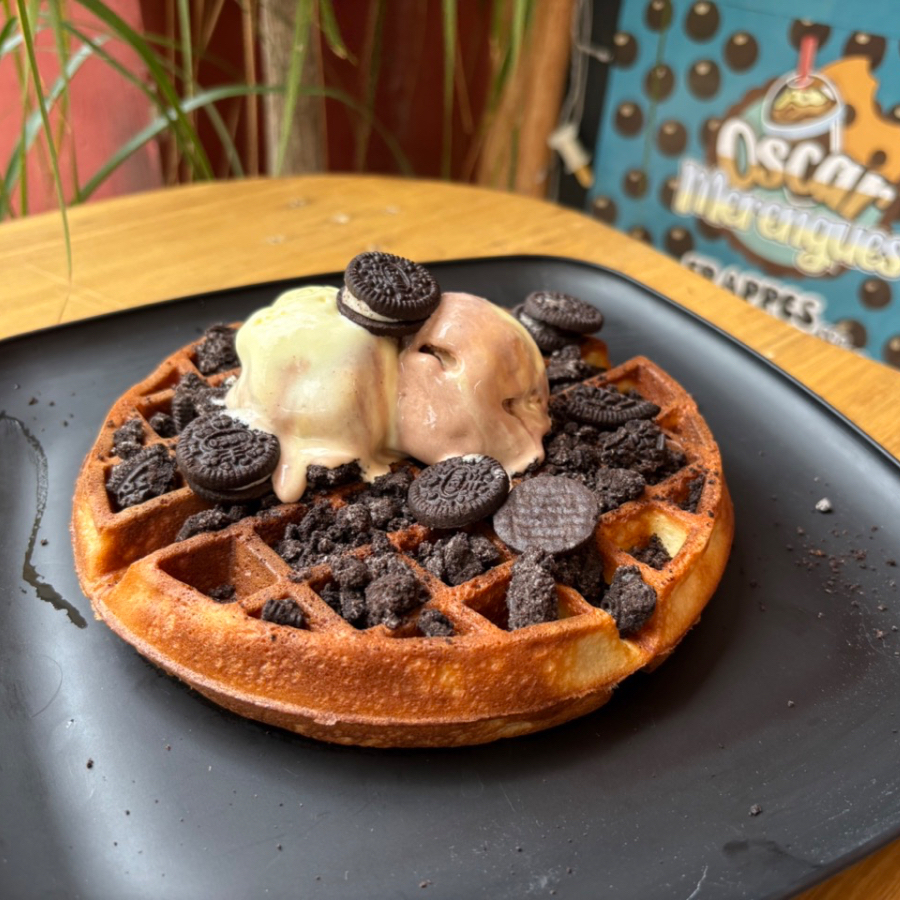 WAFFLE CRUJIENTE CON OREOS TROSEADAS Y. HELADO DE VAINILLA ARRIBA, CUBIERTO CON JARABE DE CHOCOLATE