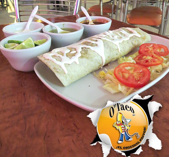 tortilla de harina bañada en frijoles rellena de carne al pastor
