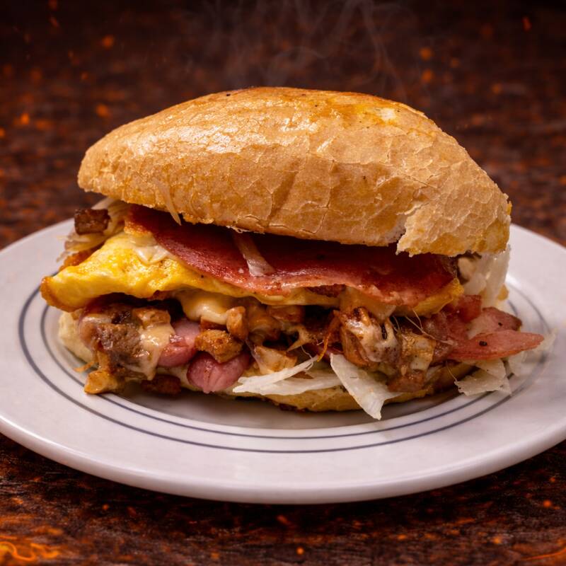 🍔Hamburguesa de doble carne, 150grms de carne picada asada o de pastor envuelta en queso derretido, acompañada de pepperoni, papas a la francesa, tomate, lechuga, cebolla asada y aderezos. (Las papas van dentro de la hamburguesa)