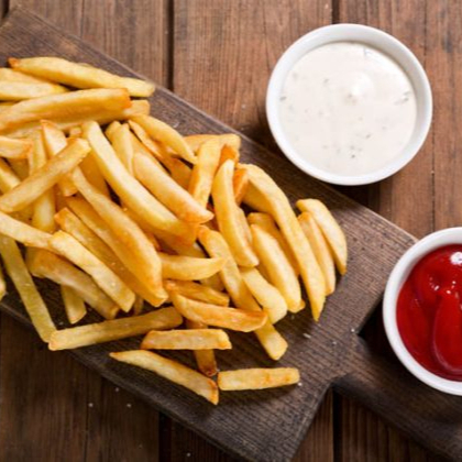 Papas a la francesa porción grande acompañada de salsa capsu y picante