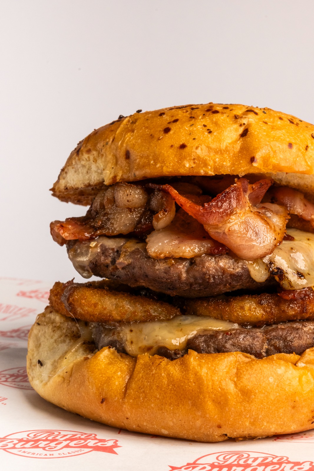 2 Carnes de 150 g 100 % res choice, pan casero con especias, 5 aros de cebolla, queso Monterrey Jack, tocino y nuestra mermelada de tocino.