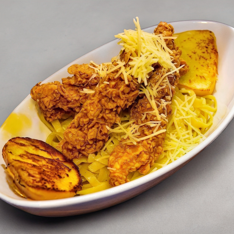 pasta al ajo a base de mantequilla y ajo, servida con parmesano frsco rayado, incluye tres tiras y dos panes con ajo, delicioso!