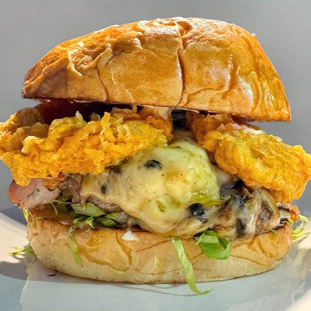 Carne de res de la mejor calidad, hecha en casa, incluye tocino, champiñones, queso gratinado y aros de cebolla